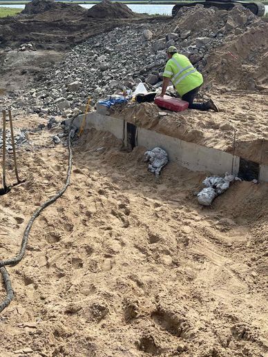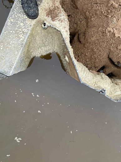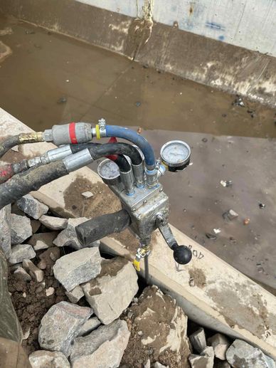 To address the water intrusion and structural concerns, our team implemented a targeted foam injection strategy using 2.5 tons of HF402 HydroFoam. HF402 was selected specifically for this repair due to the large body of water and persistently wet conditions at the site. HydroFoam is engineered to resist hydrolysis—the chemical breakdown of materials in water—and is capable of setting and maintaining dimensional stability in fully saturated conditions, making it the optimal solution for sealing the dam joints and voids.