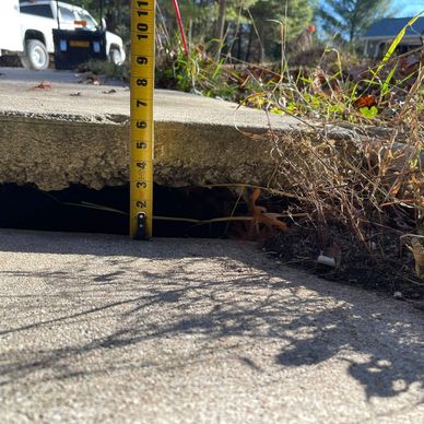 To safely bring the slab back to its original height, we used a coordinated method of polyurethane lifting foam and manual lifting jacks working together at the same time. Because the slab had dropped nearly six inches and was unsupported due to washout, it was important to lift it in a way that distributed pressure evenly and avoided placing unnecessary stress on the concrete.